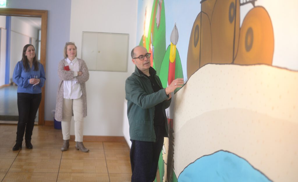 Auch der Künstler selbst zeigte sich bei der Eröffnung der Aula sehr beeindruckt von der Kreativität und Umsetzung des Projektes. Er zeichnete sogar selbst noch in das Wandbild hinein und bestärkte die Schüler darin, ihren eigenen Weg zu gehen, während er signierte.