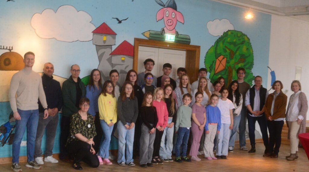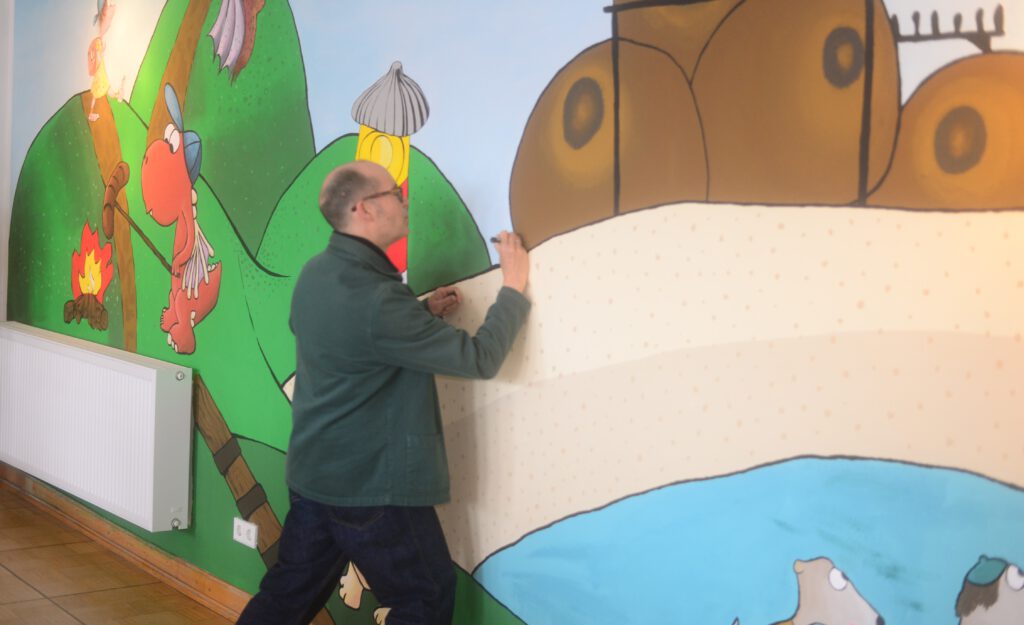 Zwischen dem 23.02. und dem 27.02.2026 bemalten wir in nur fünf Tagen eine Wand in der Aula der ISGS mit Ingo Siegners Motiven aus der Buchreihe „Der kleine Drache Kokosnuss“ und anderen speziell für die Grundschule entworfenen Motiven des Künstlers. Der Entwurf für dieses schulformübergreifende Projekt stammte von den Zwölftklässler*innen des Gymnasiums.