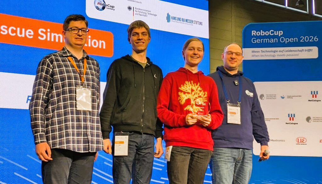 In diesem Jahr hat sich das Team, bestehend aus Torben Klugmann, Fynn Stüber und Paul Heins viel vorgenommen. Die Erfahrungen und Vorarbeiten des Teams in Bari machten sich bei den Deutschen Meisterschaften Köln bezahlt. Mit deutlichem Vorsprung holte der virtuelle Roboter des Teams in allen acht Wertungsläufen die höchste Punktzahl von den teilnehmenden Teams und wurde damit Deutscher Meister im RoboCup Junior-Wettbewerb Rescue Simulation.