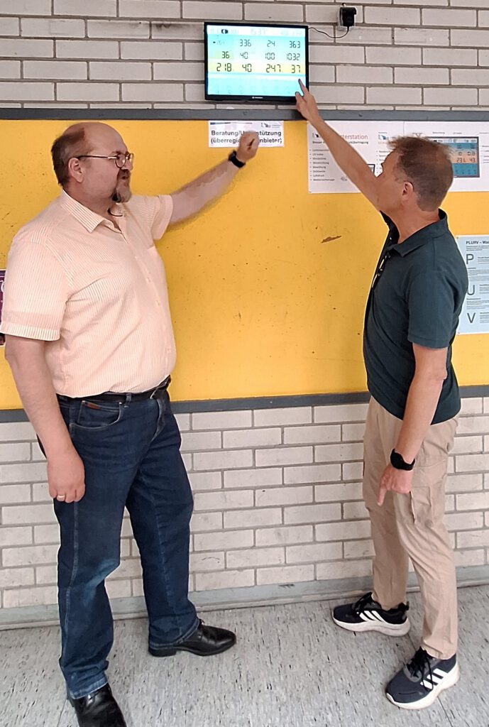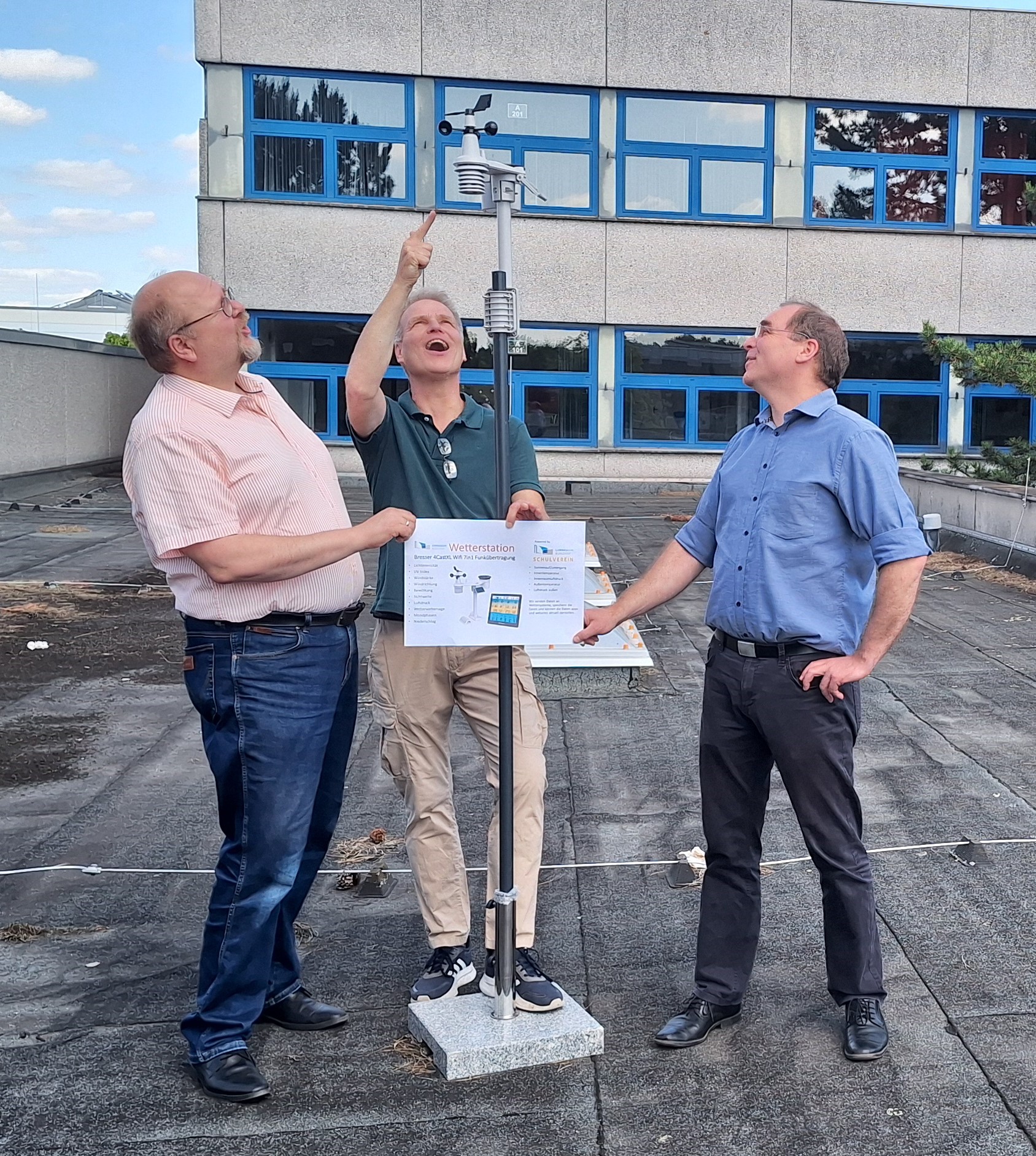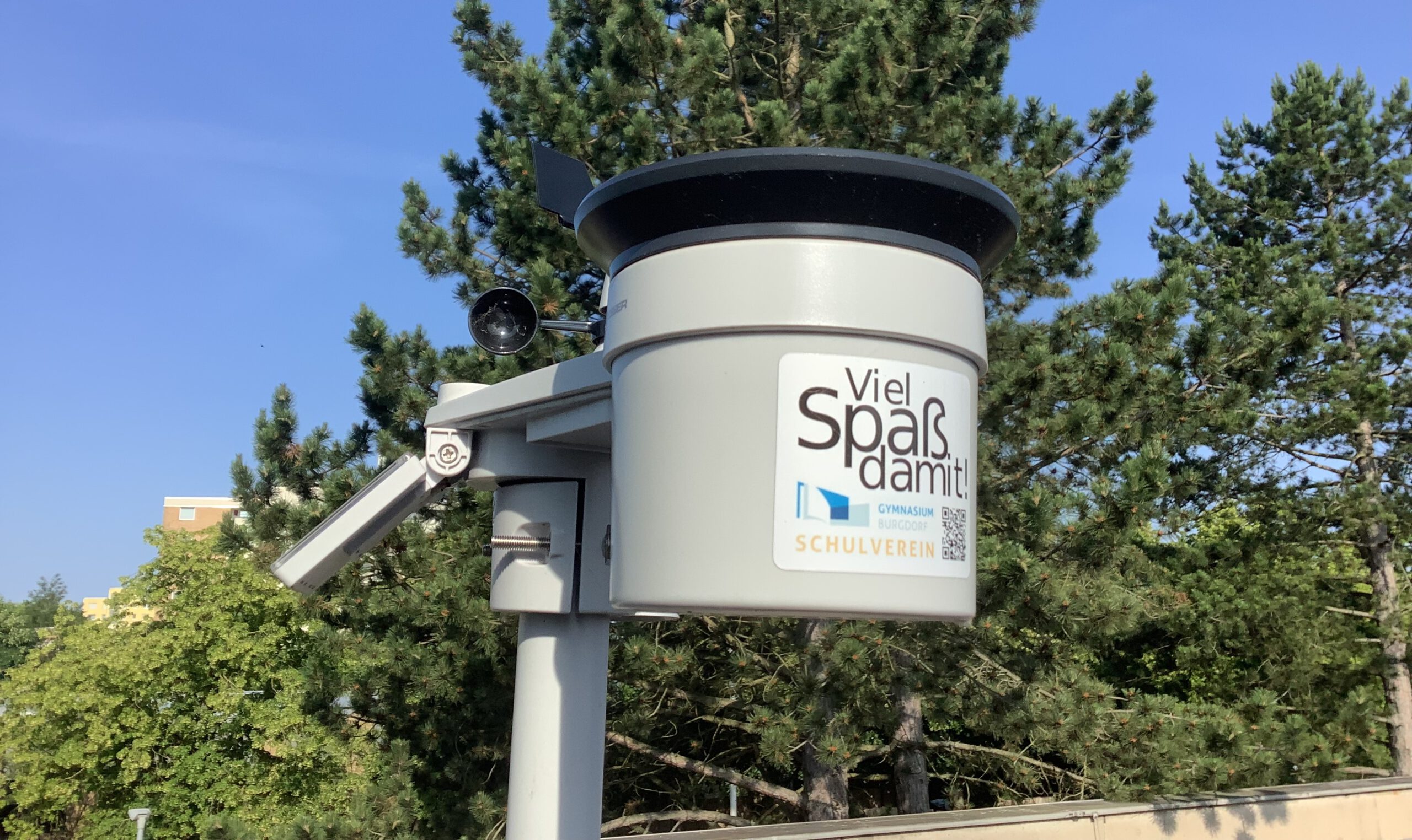 Seit einigen Tagen schon war der bunte Bildschirm mit vielen Daten im Atrium zu sehen. Und auch der Datensensor auf dem Dach der Aula steht schon seit geraumer Zeit. Jetzt endlich wurde unsere professionelle Wetterstation der Firma Bresser auch offiziell eröffnet. Die finanzielle Unterstützung des Schulvereins macht es möglich, dass am GymBu ab sofort zahlreiche eigene Wetterdaten wie Niederschlag, Temperatur, Luftfeuchtigkeit oder Windgeschwindigkeit angezeigt und in Datenbanken gespeichert für den Unterricht zur Verfügung stehen. Vielen Dank für die Unterstützung!